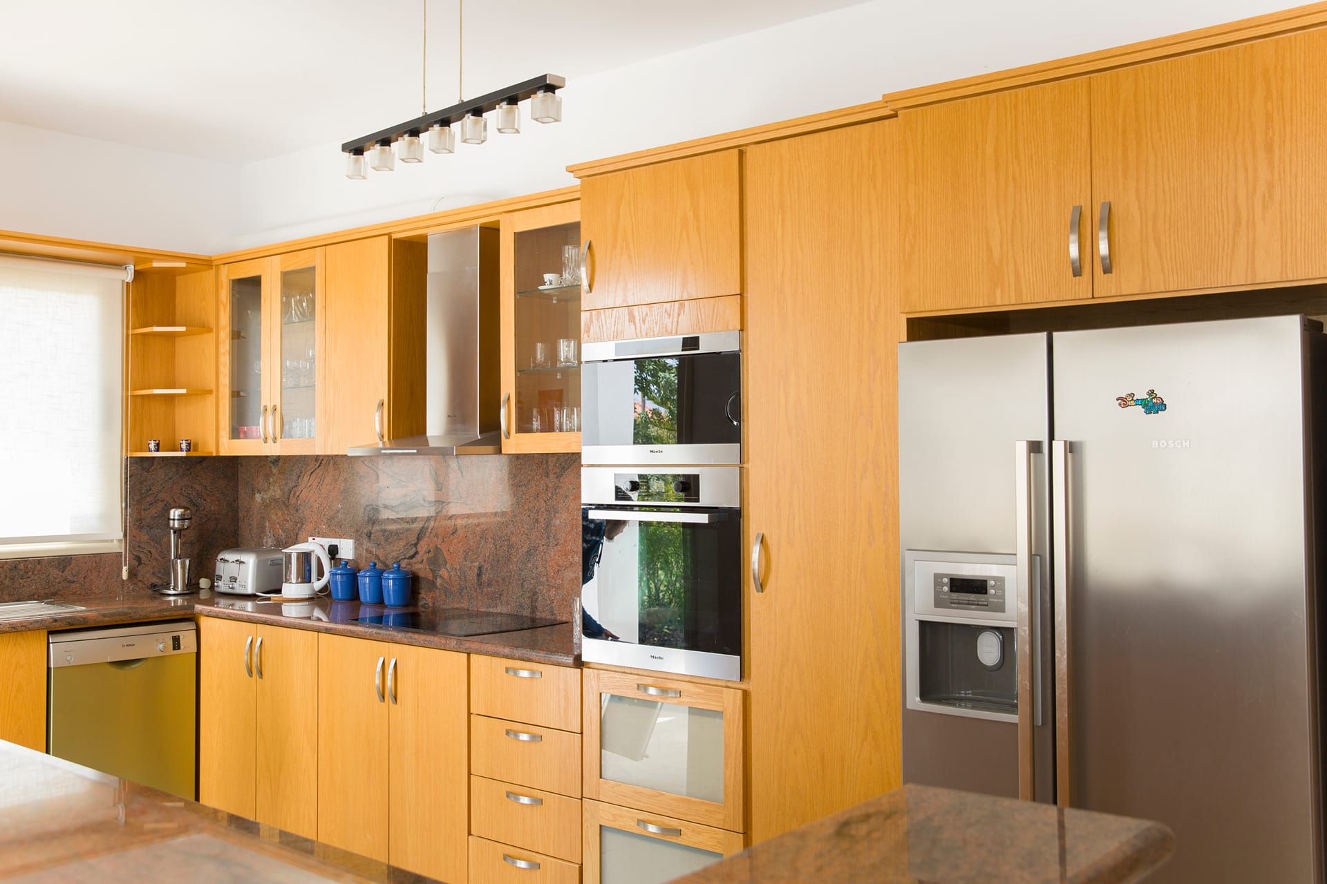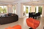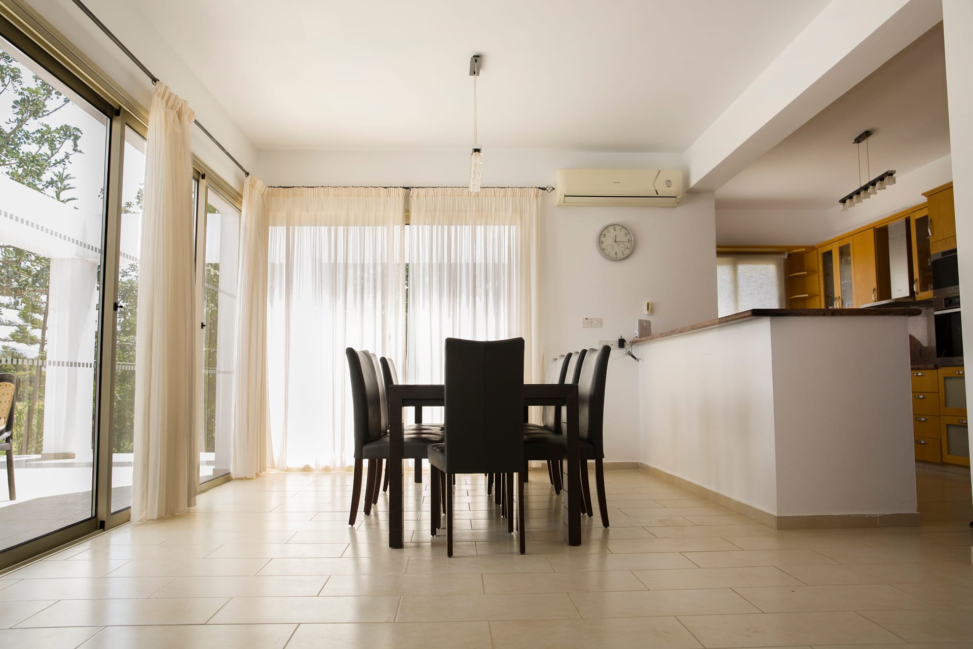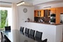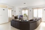 The kitchen is fully equipped for all your needs including an oven, hob, American fridge/freezer, washing machine and dishwasher. There is also a breakfast bar offering extra worktop space. There is a door located in the kitchen which leads out to the poolside terrace. The adjacent dining area with faux leather chairs seats up to 10 guests.